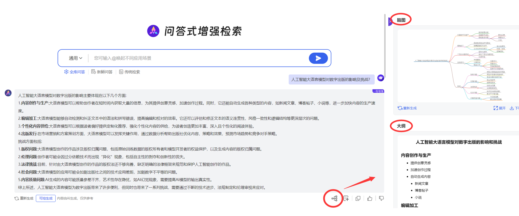 ④可控生成:鉴于每个人的知识层次和需求不同,即使同一问题,也会对答案内容的深度、领域等方面有不同要求。AI可控生成服务创新性地满足了用户个性可控的问答需求——选文可控生成实现了AI在用户选定的单篇或多篇文章生成回答;分组可控生成可基于用户选定的行业、主题、作者、时间等分组,进行文章聚类可控生成回答。
