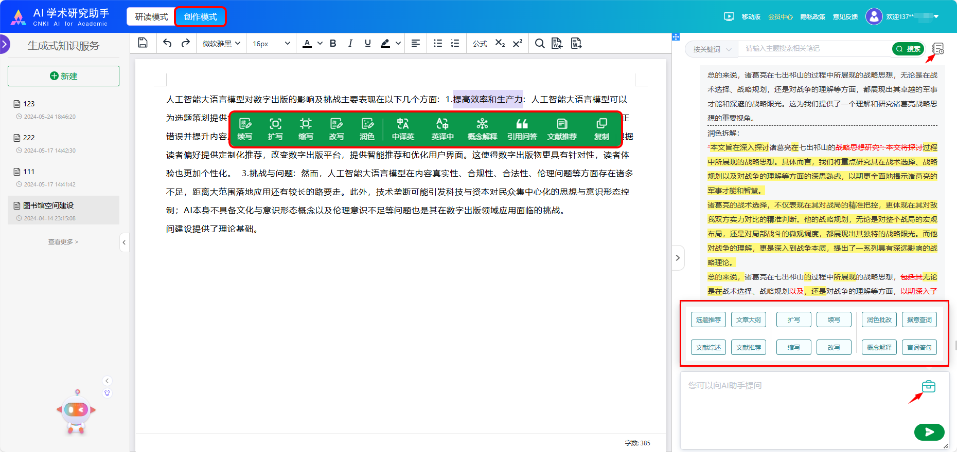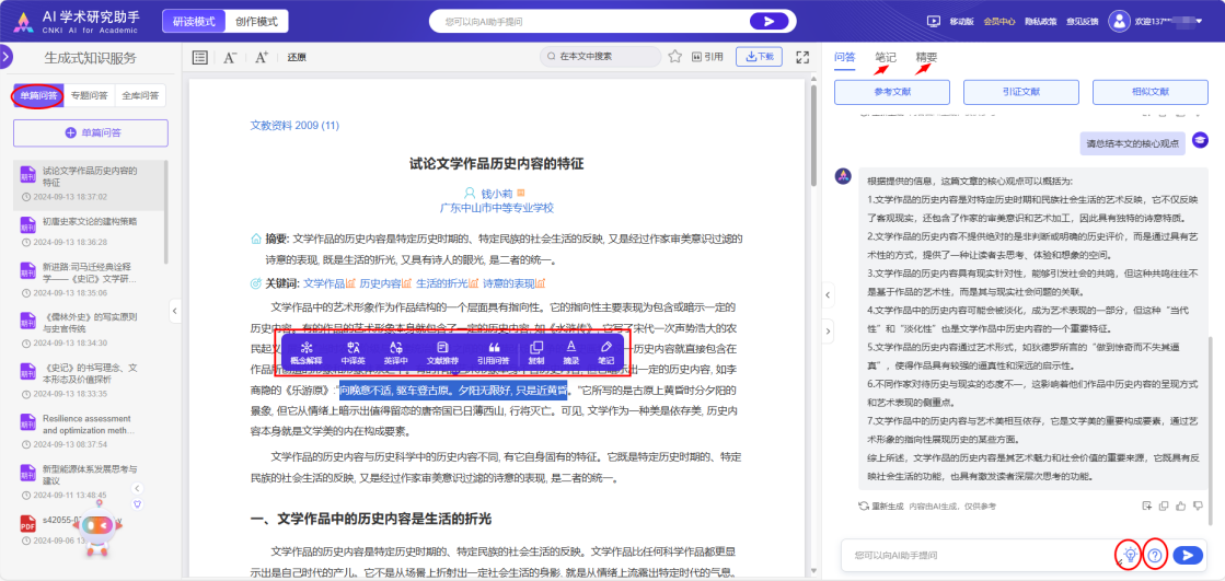 ①资料研参:AI助手将研究与创作环节有机结合,实现高效创作。当用户在研读文献时,可便捷、系统地记录研读和问答中的文献精要和研究心得,为后期创作准备翔实的学术素材。当用户进入创作阶段,可便捷的将研读资料应用在论文创作中。