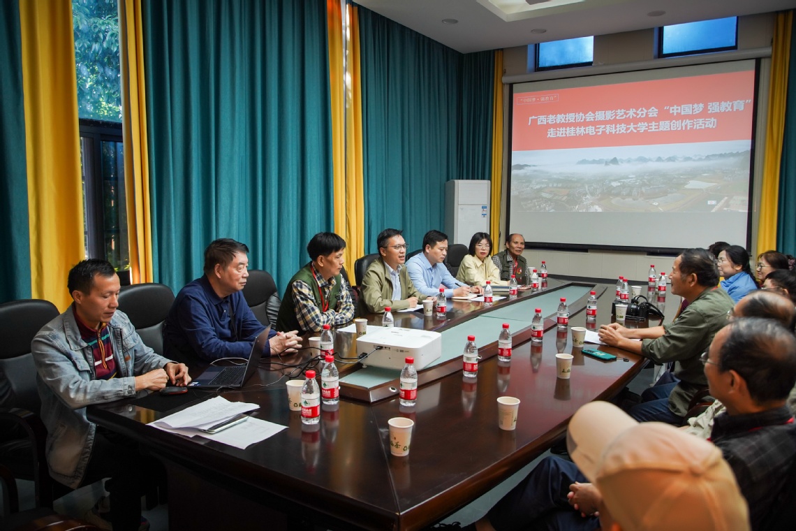 龙盛京理事长简要介绍了广西老教授协会摄影艺术分会情况以及本次来访人员情况,强调本次来桂电进行“中国梦·强教育”主题摄影采风活动目的和意义。龙理事长对桂电发展感到由衷赞叹,表示将会积极推介桂电校园美景和办学特色。随后,与会人员共同还观看了学校宣传片,双方人员还就第二天的系列创作活动进行深度交流。