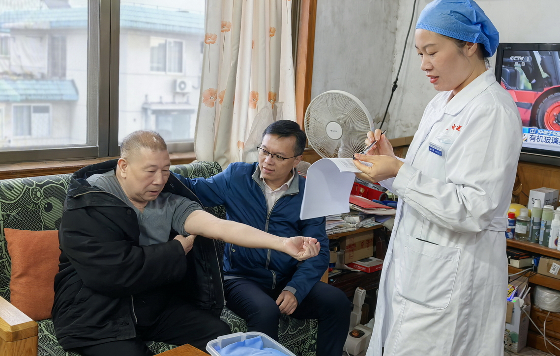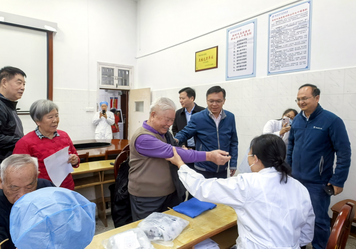 11月20日早上,陈松青副校长提前来到金鸡岭校区医院,看望慰问现场体检的离退休教职工,并与老同志亲切交谈,详细询问他们的健康及生活情况,叮嘱他们要注意适当锻炼,重视预防、保持良好心态。还嘱咐在场工作人员要周全考虑,尽心尽力做好体检服务。紧随其后,陈松青副校长与离退处、校医院相关负责人员一起,参与到为行动不便人员进行上门抽血体检服务之中。