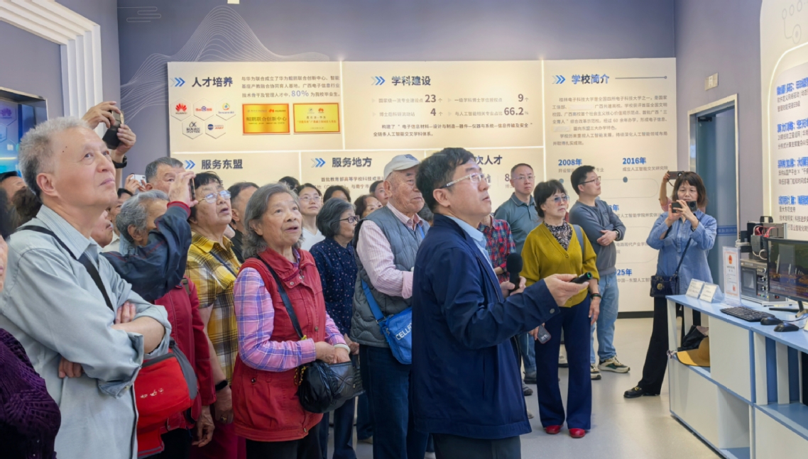 在整个过程中,很多退休教职工都拿出手机,不停地拍照记录这些令人震撼的科技成果,他们边参观边讨论,并回想着学校在人工智能领域从无到有、逐步发展壮大的历程,一路赞叹不已。大家认为这次参观“让老同志大开眼界,深信桂电大有可为,拥护学校大步向前”,同时为学校取得的成就感到无比自豪。