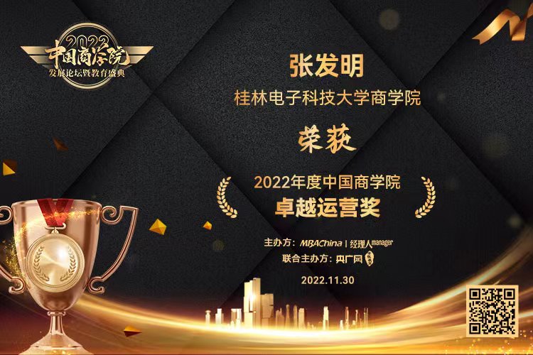2022年11月30日2022年11月30日,MBAChina和经理人杂志主办,央广网女性教育频道联合主办的“2022年度中国商学院发展论坛暨教育盛典”圆满落幕。全国商学教育者齐聚一堂,围绕商科教育行业进行评选颁奖、主题分享等一系列内容,共话商科教育发展未来,构建好中国商科教育的发展之路。在各商学院同仁的共同见证下,商学院(数字经济学院)院长兼MBA教育中心主任张发明教授获2022年度中国商学院卓越运营奖。