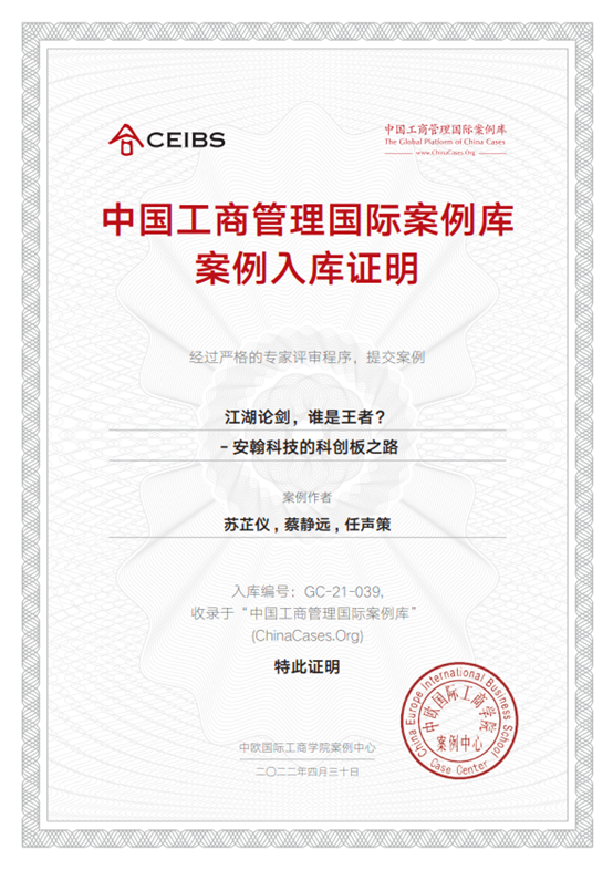 2022年12月14日我院苏芷仪教授团队开发的案例《江湖论剑,谁是王者?——安翰科技的科创板之路》经严格的专家评审程序,收录于由中欧国际工商学院创办的中国工商管理国际案例库(ChinaCases.Org)。