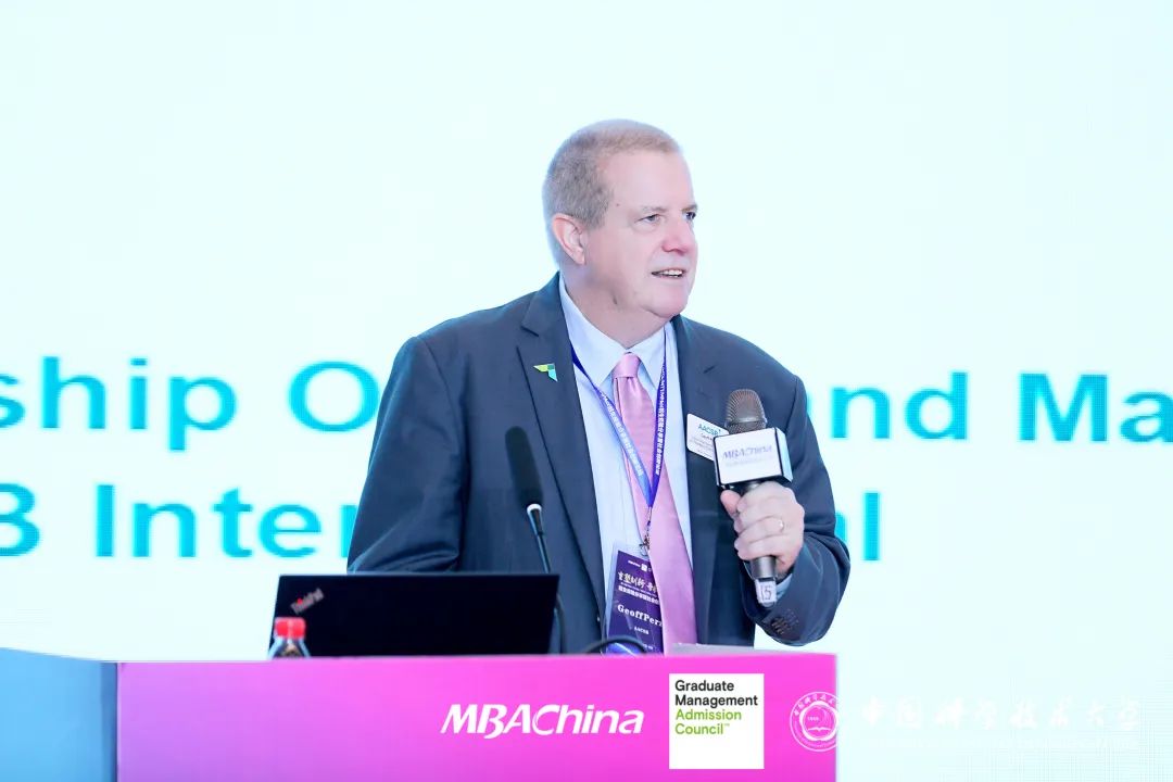 AACSB执行副总裁、全球首席成员官、亚太区首席执行官Geoff Perry围绕对标全球标准,用国际语言讲好中国商学院故事进行主题发言。他对AACSB的背景和概况进行介绍,详细说明了认证标准和决策,并为商学院的发展提出建设性意见。