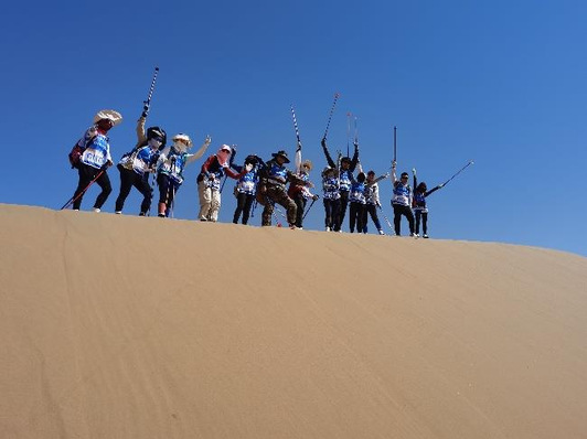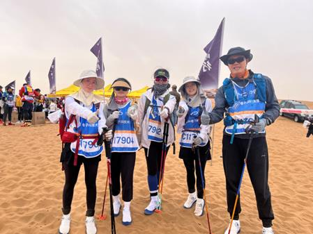 赛事前后,大家经常说笑 C 队是老年观光团,其实这个比喻真的完全失真。C队队员面对体能同比例的消耗下,最重要的工作是为 A 队和 B 队做好 强大的后勤保障,而且本届 C队的 17 名队员充分发挥了保障组的作风, 在第一天到达终点后,17 名队员在蒋慧君老师的带领下,陆续投入到 搭设营地、搬运行李与补给的工作当中,尤其是 17 名成员中我们的 12名女战友,真的是巾帼不让须眉,承担了搭设营地的主力,更参与到了搬运补给的行列中。很难想象,在沙漠徒步完赛消耗较大体能的前提下,在炎炎烈日的照射下,又花费了近 3 个小时的时间搭建帐篷,只为我们的大部队回来能有一个休整、补充体能的空间。当看见大家都 累得坐在或躺在沙漠中,当看见大家步履蹒跚的爬坡去一趟趟搬运补给,我知道我们每个人的心理是幸福的,因为我们完成了任务,因为 我们战胜了疲劳,因为我们成就了我们。当然,我们 C队由于缺乏经 验和肌肉放松的培训,在 A、B 队队员回来后,并未能够给予大家按 摩进行肌肉放松,这也是我们在以后的亚沙赛事中需要重点加强的方面。最后,说一说我所在的 C 队的小组。在 C 队出发前,我们 C队 17 人共分成三个小组,我和蒋慧君老师、高宇、黄华、吴旋一起作为 C 队的前锋组,走在队伍的前面。说实话我对自己的体能能否三天完成35KM 的要求并无把握,从随队出征那一刻起,我的心里只想着一件事情:我千万不 要倒数第一,自己丢人不要紧,但千万不要给学校丢脸,这是我 选择走在 C 队前锋组的原因。可 是在前锋组也真的是压力好大,前锋组只有我一个男士,所以只能咬着牙与四位女战友同步前行。