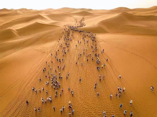 沙漠徒步亦或慢跑都是我从未有过的体验,其软弱的支撑以及 360度对脚踝和腿部肌肉的全方位拉动,是沙漠与登山和越野之间最大的 差异之一。我虽在 C队(三天总里程35KM),但对我的体能来说已是 最大的挑战,因此我们战队的 A 、B 队的同学,都被我视为大神级的存在,膜拜与学习。