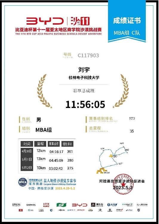 2023年05月25日现在是 2023 年 5 月 16日傍晚,在本学期学习即将结束之时,自己沉下思绪续写亚沙感悟与感想,翻看照片和视频,从 4 月 28日启程 开始至 5 月 3日的回归, 思绪万千, 怀念和大家在腾格里的日日夜夜,感动我们每一个人为学校、为自己拼搏的每个瞬间。今天再次回看“沙11 官方视频”,居然又留下了泪水,好诧异。泪水中有对所有亚沙参赛 同学们坚毅拼搏的感动,有对 6 天和我们桂电战友团结协作的怀念,更有对自己挑战自我的成功喜悦,这就是亚沙的魅力所在,沙 11 的文案“天涯海角天荒地老,只等你摔杯为号,就跟他干,Just那么 年少,Just 那么狂”,这正是青春的馈赠,与强者同行,登峰造极,顶峰相见。