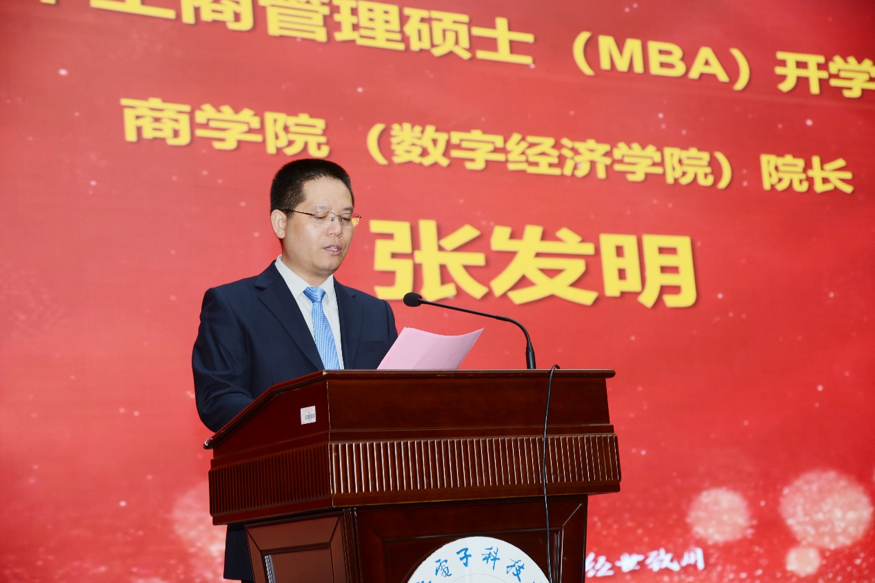 随后,张发明院长致辞。他首先代表学院向MBA研究生新生表示热烈的欢迎和祝贺。他介绍了商学院(数字经济学院)的历史沿革、办学特色和发展成就,强调MBA教育在学院发展战略中的重要地位和作用。他向MBA新生提出三点要求共勉:塑造高尚品格,勇担时代使命;端正学习态度,磨砺严谨作风;培养创新思维,拓展视野格局。他希望新同学能够依托学院成熟的人才培养体系,践行“融理弘商 经世致用”的MBA核心价值,迎接挑战,成为各行各业的领军人才。