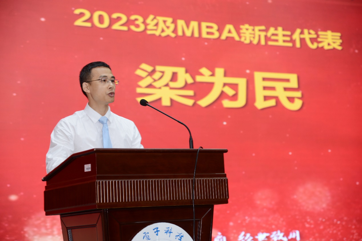梁为民同学代表MBA新生发言。他代表全体新生向学校和老师们表示感谢和敬意,向校友和同学们给予祝福和期待。他表示,选择桂电MBA是一种光荣和责任,是人生奋斗过程的一次新开始。他希望新同学们能够珍惜宝贵机会,开拓创新,务实勤奋,以“正德 厚学 笃行 致新”的校训作为指引,以“融理弘商 经世致用”的MBA核心价值为依托,共同学习,共同进步,成长成才。