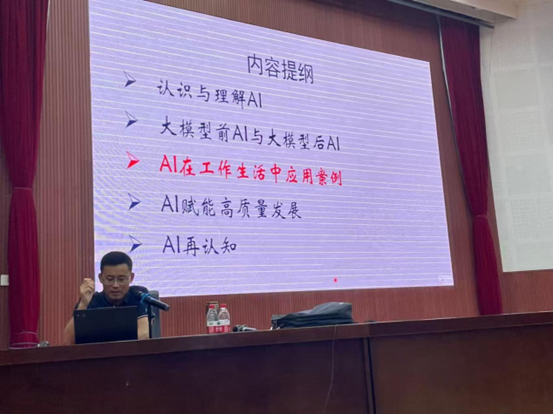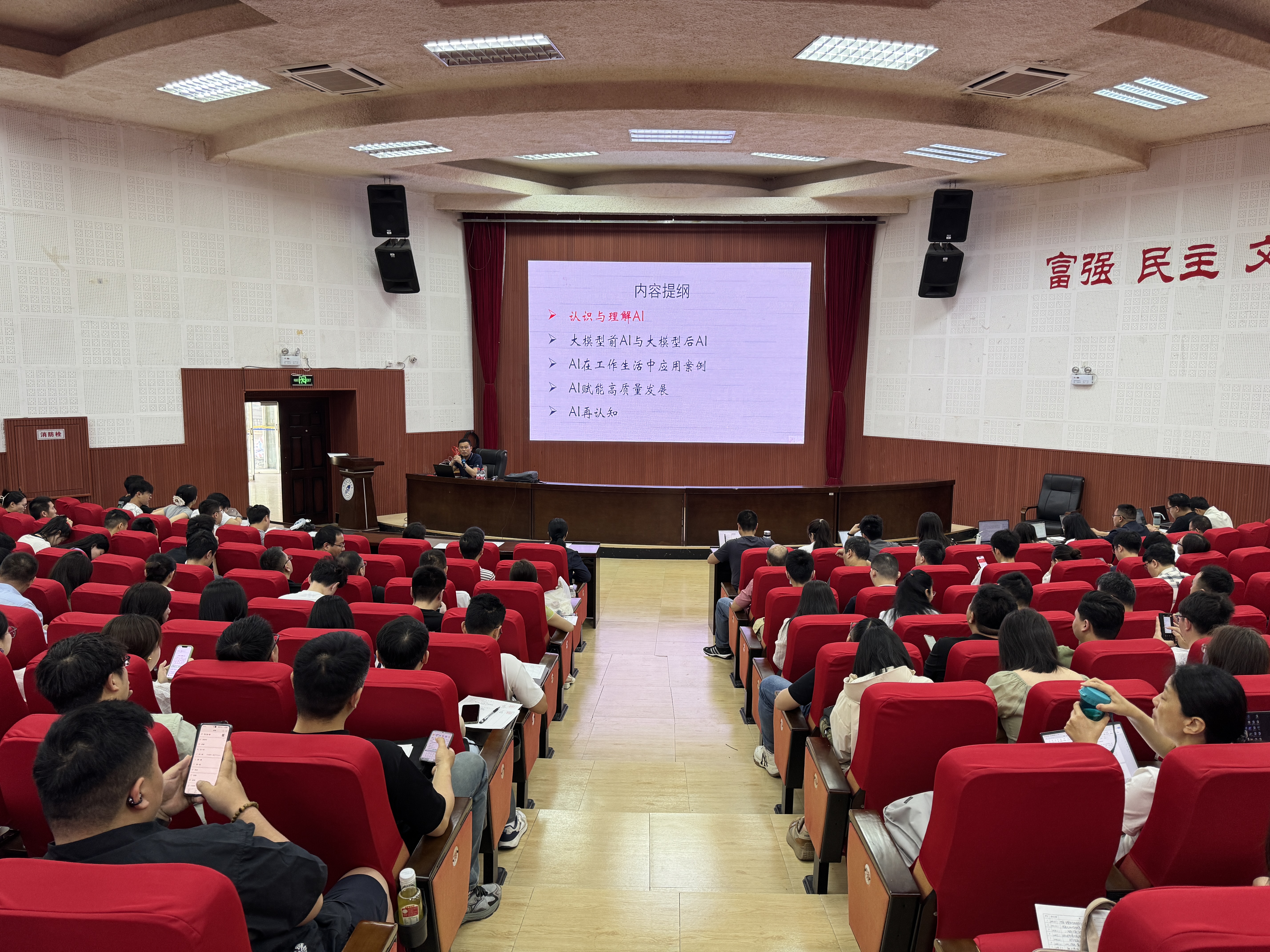 在人工智能讲座中,张敬伟院长化身知识向导,带领同学们深入探索 AI 世界。张院长从理论根源出发,对 AI 的认知与理解进行了详尽解读,涵盖了从实证、理论、计算到数据等研究范式的演变历程,并深入介绍了生成式 AI 从萌芽到蓬勃发展的全过程。通过对比大模型出现前后的 AI 发展,讲解了通用语言模型、多模态模型等常见大模型类型。在实践应用层面,张院长以自动搬运 AGV 机器人和社保大模型结合数字人为例,生动展示了 AI 在智能制造、政务服务等领域的强大赋能作用。他还阐述了 AI 在教学、社会治理等领域推动高质量发展的成果,为同学们勾勒出一幅 AI 领域的全景图,启发大家对 AI 在未来商业与社会发展中应用的深入思考。