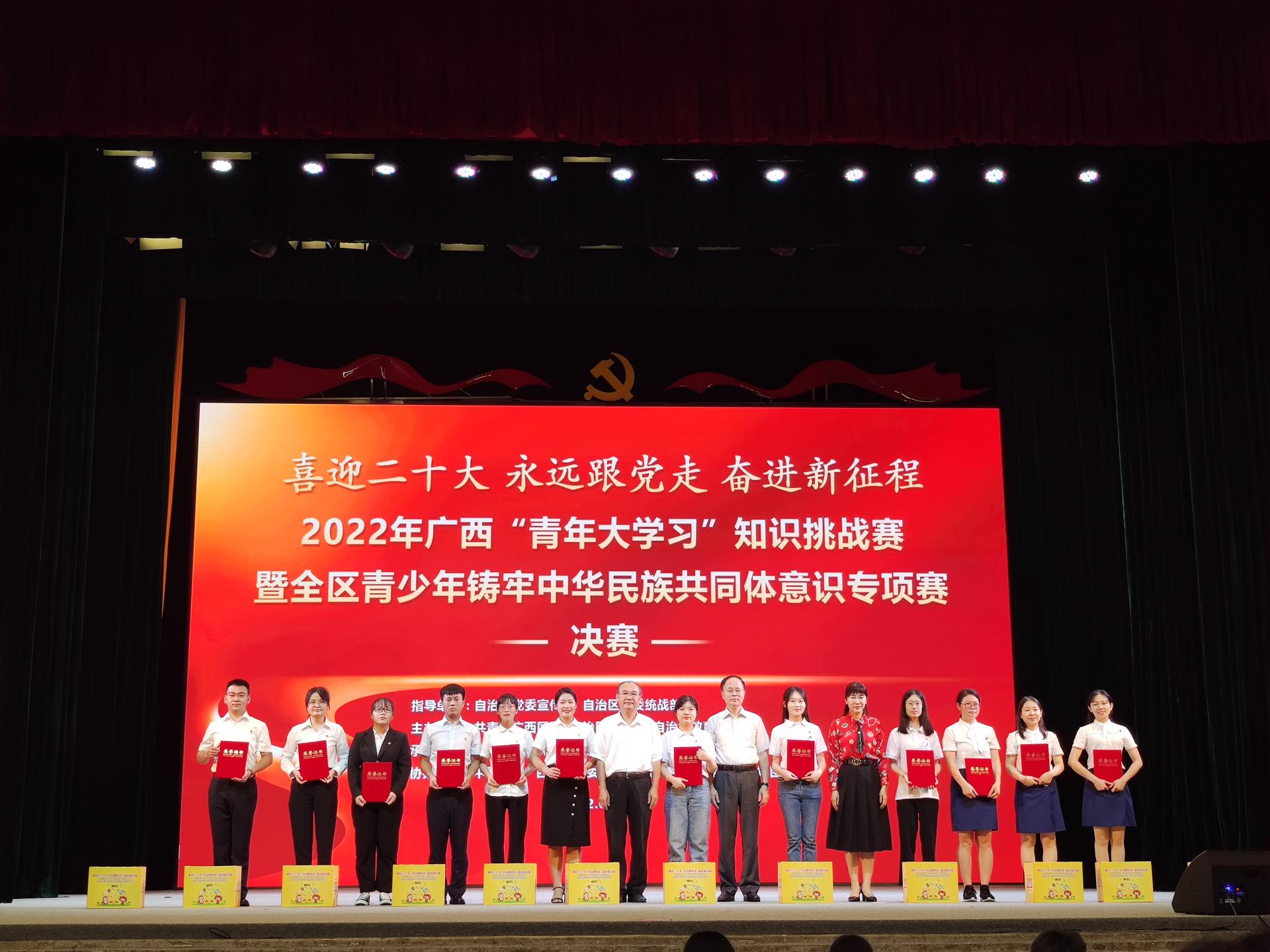 6月12日上午,“喜迎二十大、永远跟党走、奋进新征程”2022年广西“青年大学习”知识挑战赛暨全区青少年铸牢中华民族共同体意识专项赛决赛在广西民族大学举办。本次比赛四月中旬开始筹备,历时近两月,经过院级、校级和区级的层层选拔,我院研究生万晋旭、彭仟萍、王岩,在全区几十所高校、单位中脱颖而出,以优异成绩入围决赛。经过激烈角逐,最终获得全区三等奖(自治区第五名)的好成绩。