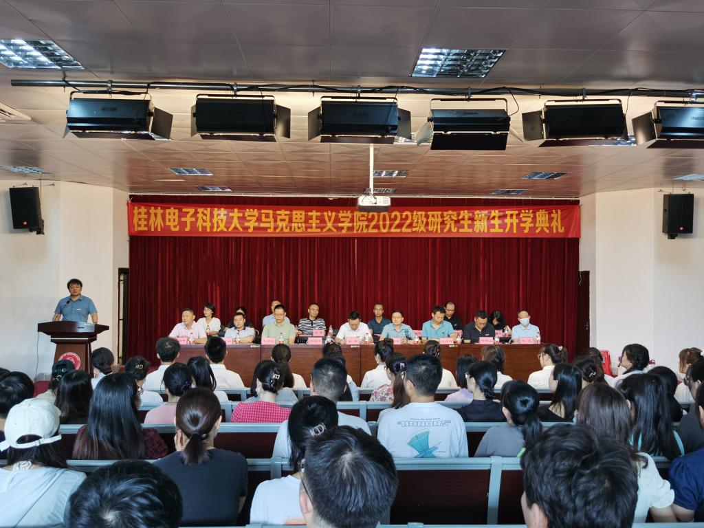 院长邓国峰首先代表马克思主义学院全体师生对2022级新生的到来表示热烈的欢迎和诚挚的祝贺,他从马克思主义理论学科发展、学院科研平台、教学资源等方面详细介绍了学院的优势和特色,并结合我院历届研究生的成长特点向大家提出切实可行的学习科研以及个人发展建议。导师代表龙海平教授向新生致词,他提到做学问要沉得下心,要树立宏远的理想,做好规划并脚踏实地完成。在读生代表许桂杰同学鼓励师弟、师妹们要勤奋共勉,并分享了到马院一年多以来的所学所感。新生代表盛薇同学表达了对新征程的憧憬,并表示将牢记“正德厚学,笃行致新”的校训精神,在新的求学路上努力完善知识结构,钻研理论内涵,丰富实践经验,脚踏实地,以梦为马,用实际行动为党和国家的发展贡献自己的青春力量。学院党委书记岳峰在总结讲话中勉励同学们要在桂电马院历练成长、不断进步,在马信马,在马研马,在马言马,在马爱马,做无愧于时代的弄潮儿,做无愧于祖国的奋斗者。典礼上,导师为新生代表馈赠了学院为他们精心准备的新生礼包。典礼伴随着庄严的国际歌圆满落幕。