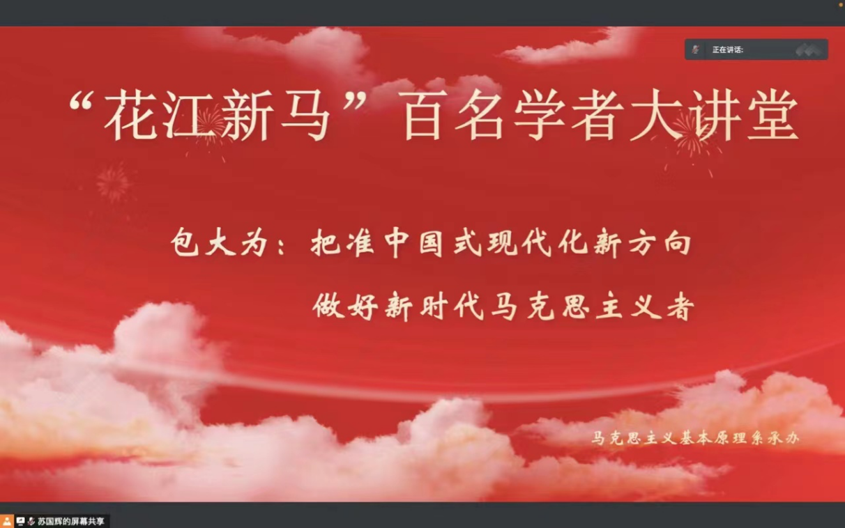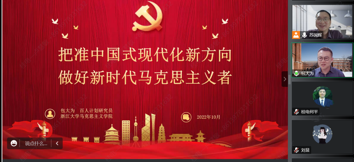 10月26日晚,马克思主义基本原理系2022年学术讲座第一讲(“‘花江新马’大讲堂”——马克思主义理论学科建设暨热点问题百位学者系列论坛第五讲)开讲了,浙江大学包大为教授(博士生导师)作为本次受邀专家在线上做了题为“把准中国式现代化新方向,做好新时代马克思主义者”的讲座,讲座由副院长苏国辉教授主持,马克思主义基本原理系全体教师、马克思主义学院研究生等130余人参加了讲座和研讨。