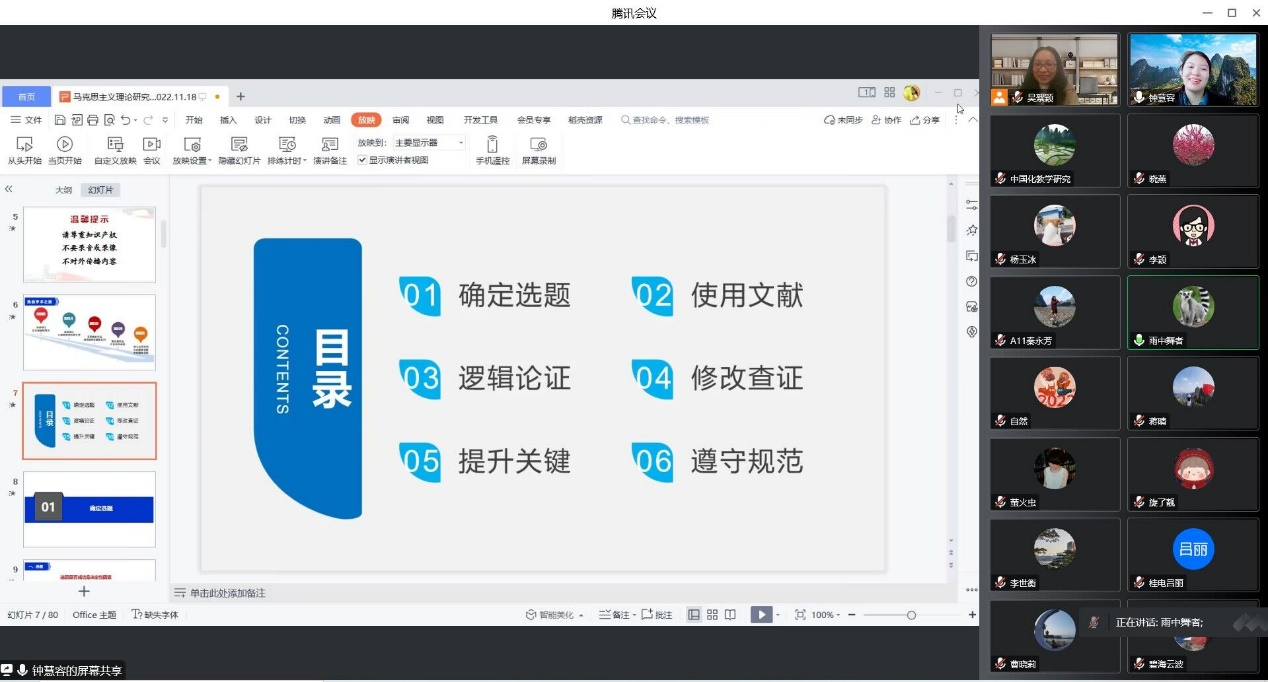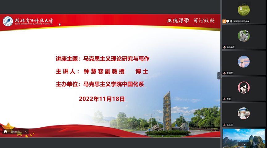 2022年11月18日下午,广西师范大学副教授、广西“五一劳动奖章”获得者、广西高等学校千名中青年骨干教师钟慧容博士应邀为马克思主义中国化系作题为“马克思主义理论研究与写作”的线上学术讲座,报告由马克思主义中国化系副主任吴絮颖副教授主持,共计60余位师生参与聆听学习。在讲座中,钟慧容博士结合自己多年的学术研究心得和经验,从分析马克思主义理论一级学科的归属和边界入手,在“确定选题、使用文献、逻辑论证、修改查证、提升关键、遵守规范”六个方面系统论述马克思主义理论研究必须遵守的学术精神和写作方法。最后提出两个结合:既要把学术规范和专业精神结合起来,又要把教学与科研结合起来,在教学中发现问题,在科研中解决问题;以科研支撑教学,用理论铸魂育人。在自由交流环节,钟慧容博士就青年教师提出的如何处理好教学与科研的关系、如何正确选题和发表高质量文章等现实问题做出耐心细致的解答。钟慧容博士的讲座主题鲜明、逻辑严谨、实用性强,可谓精彩纷呈、干货满满,为思想政治理论课教师如何做到教研相促、教学相长指明了方向。