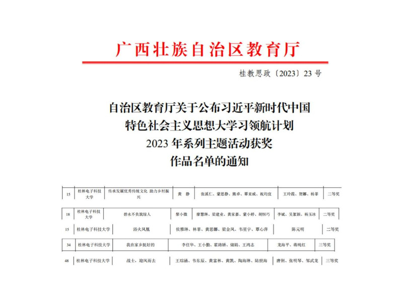 在“全区高校大学生讲思政课公开课展示活动”中,由三亿官方官网三亿(中国)_三亿(中国)马院教师王玲霞、贺娜、杨菲指导,黄静、张溪仁、蒙思静等6名学生组团主讲的《传承发展优秀传统文化助力乡村振兴》和教师李斌、吴絮颖、杨玉冰指导,黎小微、廖慧琳、梁建业等6名学生组团主讲的《碧水不负筑绿人》两个作品荣获二等奖。