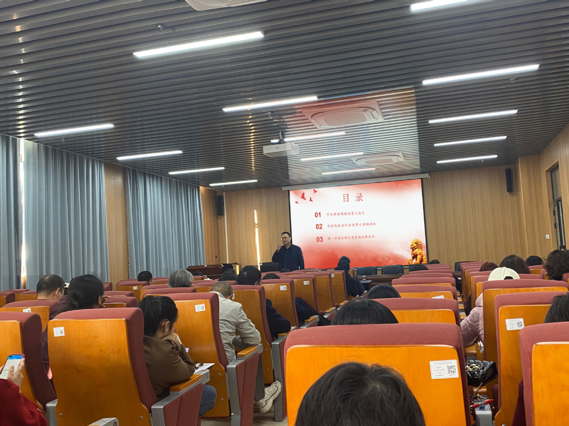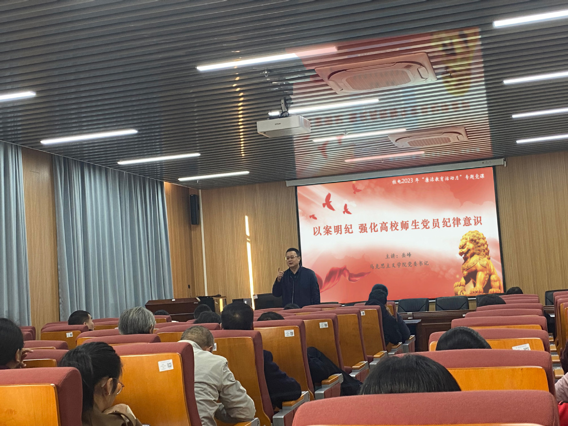 为响应学校2023 年“廉洁教育活动月”活动,11月17日下午,学院在文科综合楼223室举办 “以案明纪强化高校师生党员纪律意识”专题党课。学院党委书记岳峰授课,全体教职工、研究生党员参加。