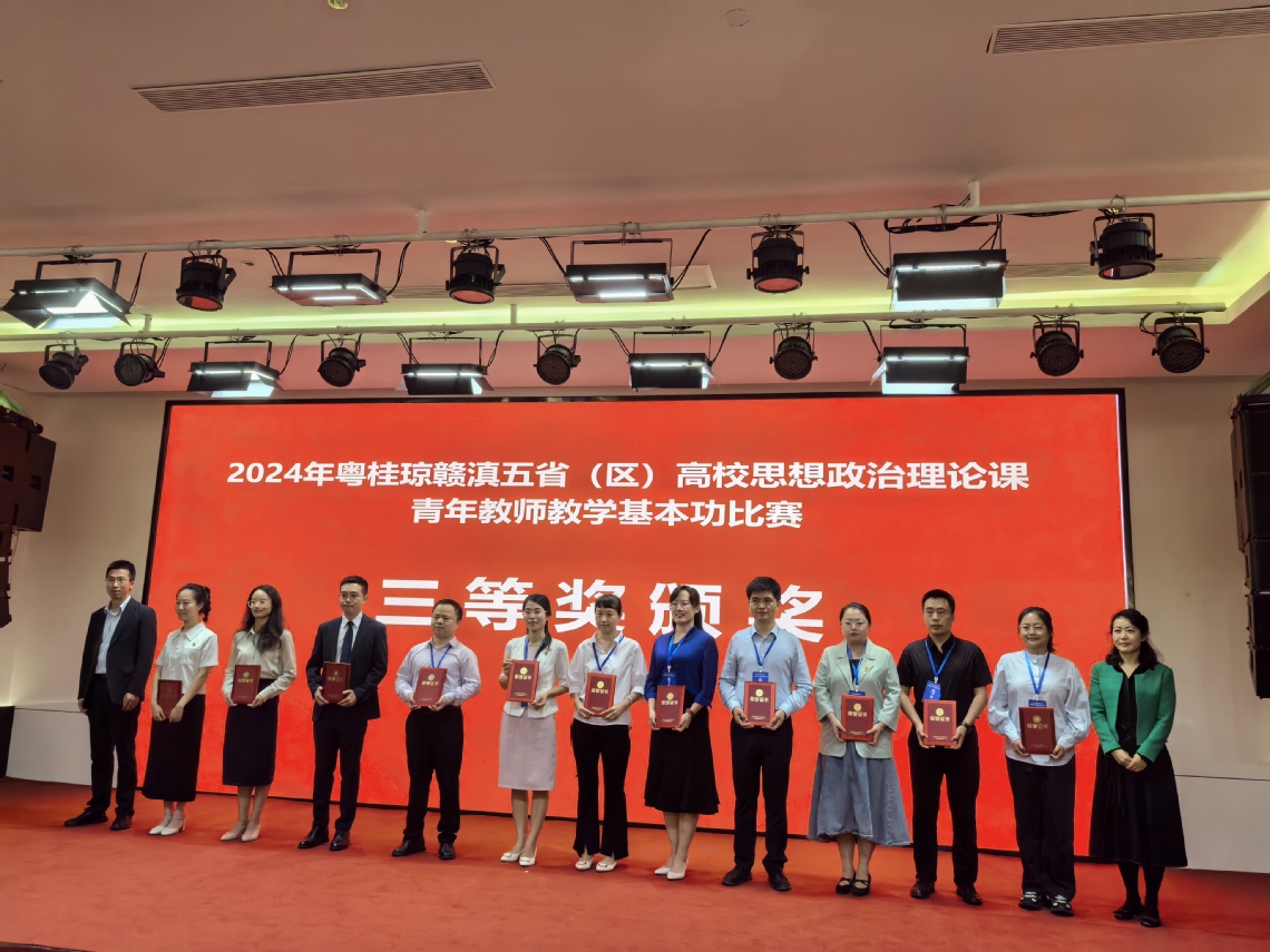 2024 年 11 月 15 日至 16 日,备受瞩目的粤桂琼赣滇五省(区)高校思想政治理论课青年教师教学基本功比赛在江西上饶隆重举行。来自五省(区)的 40 名优秀青年教师齐聚一堂,展开激烈角逐,同时有 200 余名教师到场观摩学习。在此次大赛中,三亿官方官网三亿(中国)_三亿(中国)马克思主义学院的贺旋老师荣获三等奖,较好的完成了教学展示。