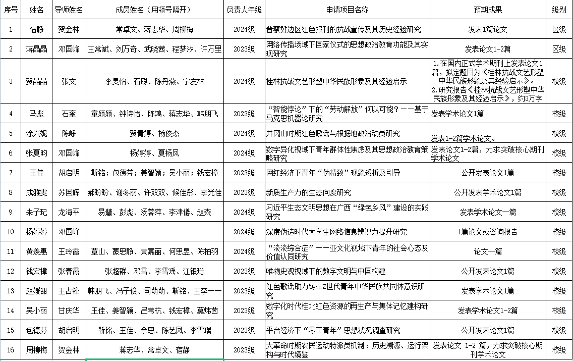 根据《关于申报2025年广西研究生教育创新计划项目的通知》文件精神要求,我院组织了2025年研究生创新项目的申报工作,经研究生申请,学院组织专家评审,拟推荐出研究生创新项目16个项(区级2项和校级14项),现将名单予以公示。