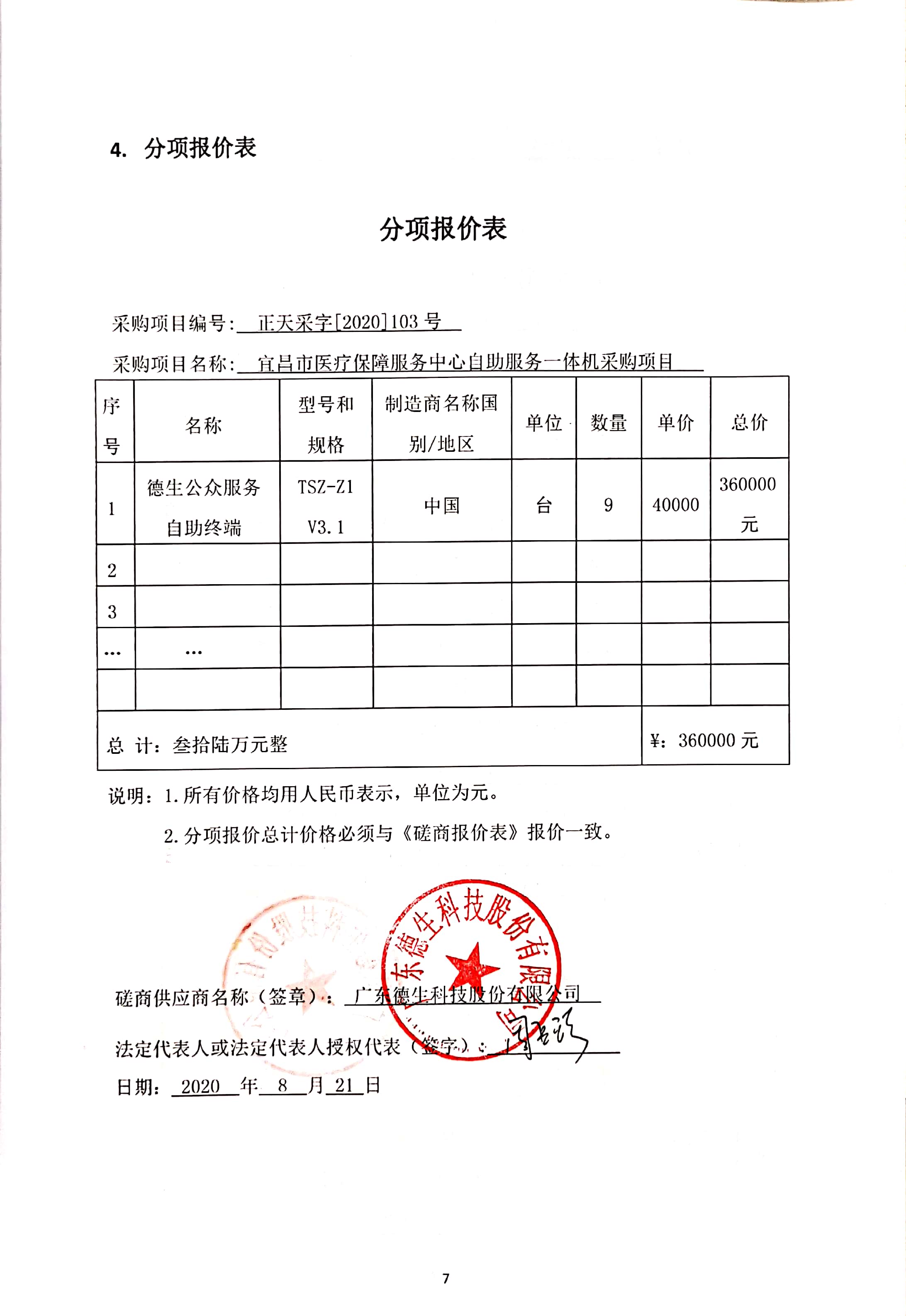 名称:宜昌市医疗保障服务中心自助服务一体机采购项目 品牌:德生公众服务自助终端,TSZ-Z1 V3.1。 规格型号:详见附件。 数量:9台,详见附件。 单价:第一轮报价详见附件。 |