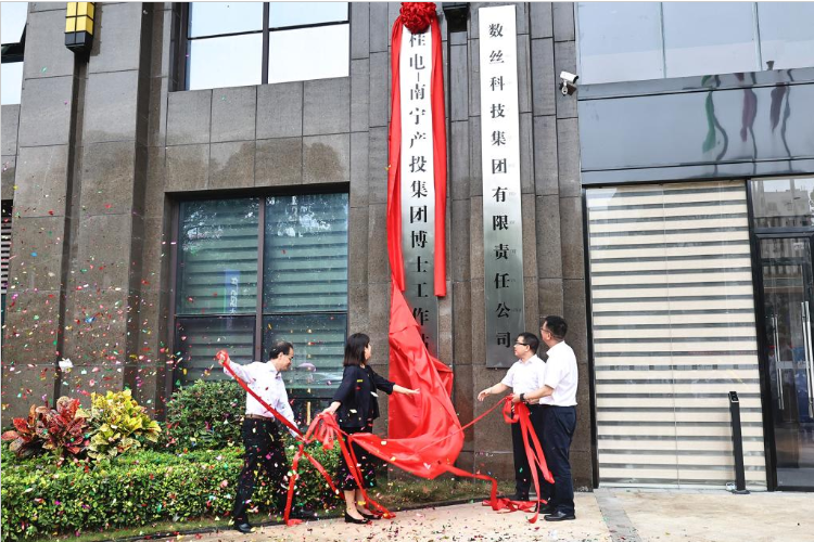 签约仪式后,徐华蕊、王玥、黄启年、苏金锐共同为“桂电—南宁产投集团博士工作站”揭牌。