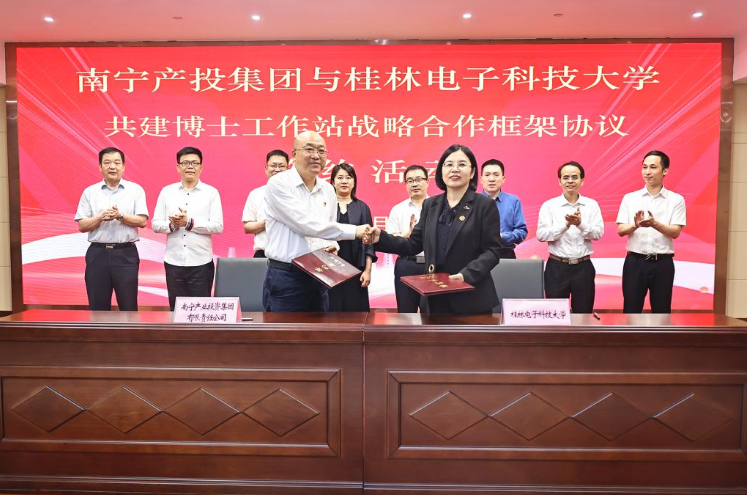 5月10日,“桂电—南宁产投集团博士工作站”在南宁产投集团揭牌成立。校长徐华蕊,南宁市委副秘书长王玥,南宁产业投资集团党委书记、董事长黄启年,南宁市人社局四级调研员、党组成员苏金锐,项目企业代表等参加签约和揭牌仪式。