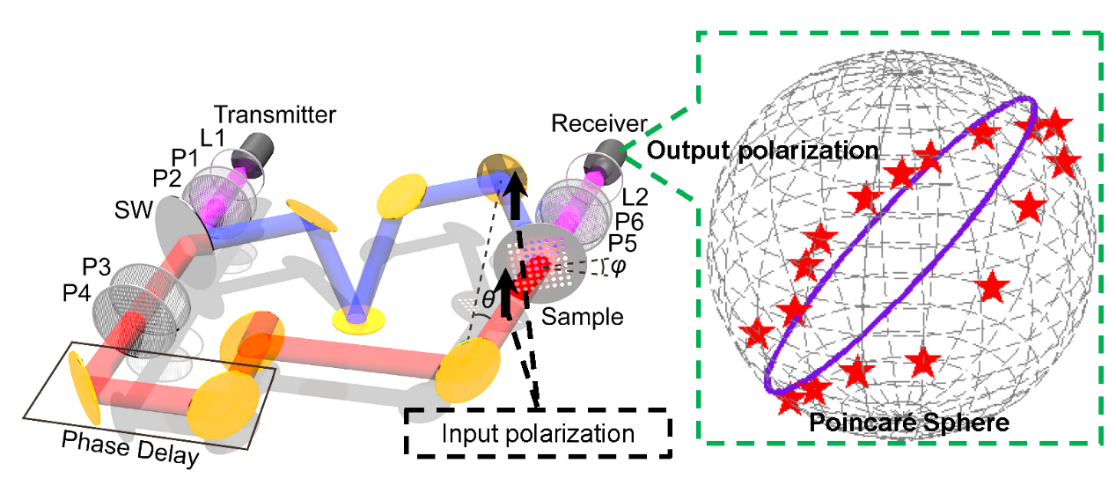 图1.(左)基于BIC的太赫兹全偏振相干操控测量系统示意;(右)特定入射角θ和样品面内旋转角φ下,输出偏振态随两输入太赫兹波间相对相位延迟在庞加莱球上的演化情况。