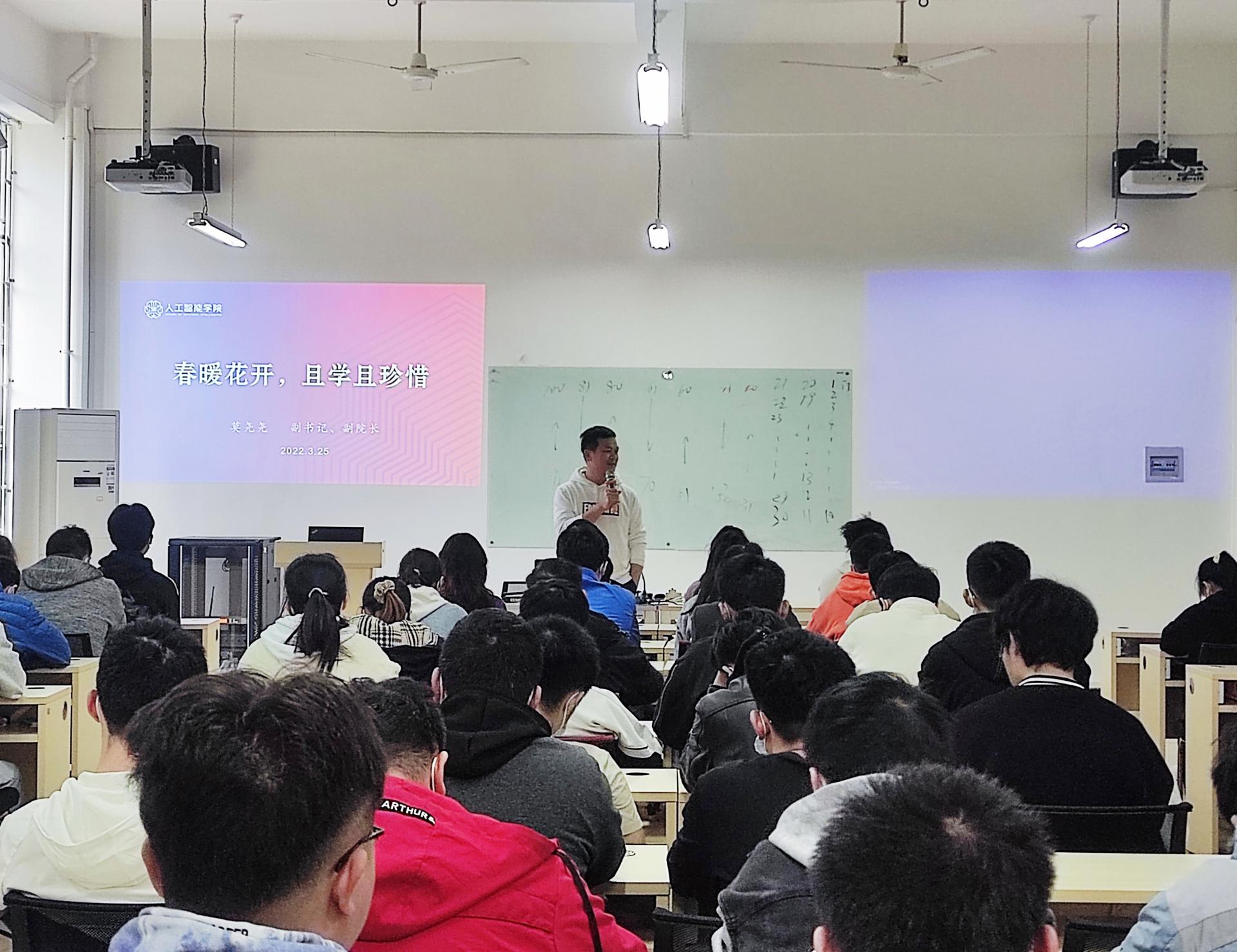 为进一步加强学风建设,坚定2019级学生考研就业信心,引导同学们积极做好学业规划,3月25日下午,学院在实训楼召开了“春暖花开,且学且珍惜”——2019级学生考研、就业动员会。学院党委副书记、副院长莫尧尧、2019级辅导员、2019级全体学生参加了动员会。