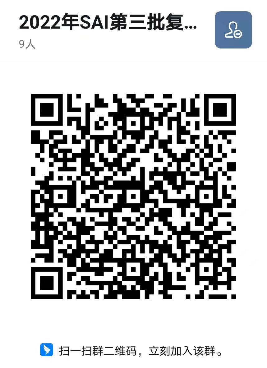方式:获得复试资格的考生,复试前在电脑端或手机端下载“钉钉”,用考生报考时用的手机号进行实名注册(认证),备注姓名+手机,申请加入“2022年SAI第三批复试群”,逾期未加入复试群视为放弃复试资格,钉钉群二维码详见附件(该文件末尾)。严禁未实名认证或非复试名单中的考生申请加入。