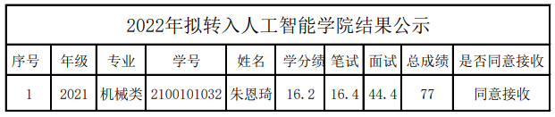 根据人工智能学院2022年本科生转专业工作实施方案,经学院专家组面试,综合学生学分绩、笔试成绩,面试成绩,朱恩琦同学符合2022人工智能学院转专业条件。现对2022年人工智能学院接收转专业学生结果予以公示。公示期为三个工作日。