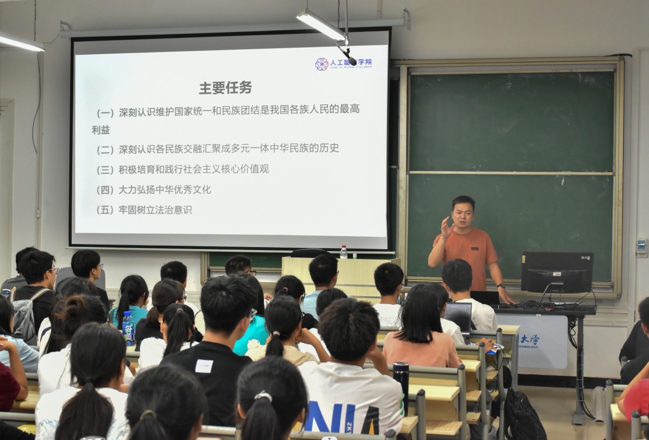 9月25日,学院党委副书记莫尧尧在实训楼218教室,给学院2022级全体新生讲授了铸牢中华民族共同体意识专题教育课。