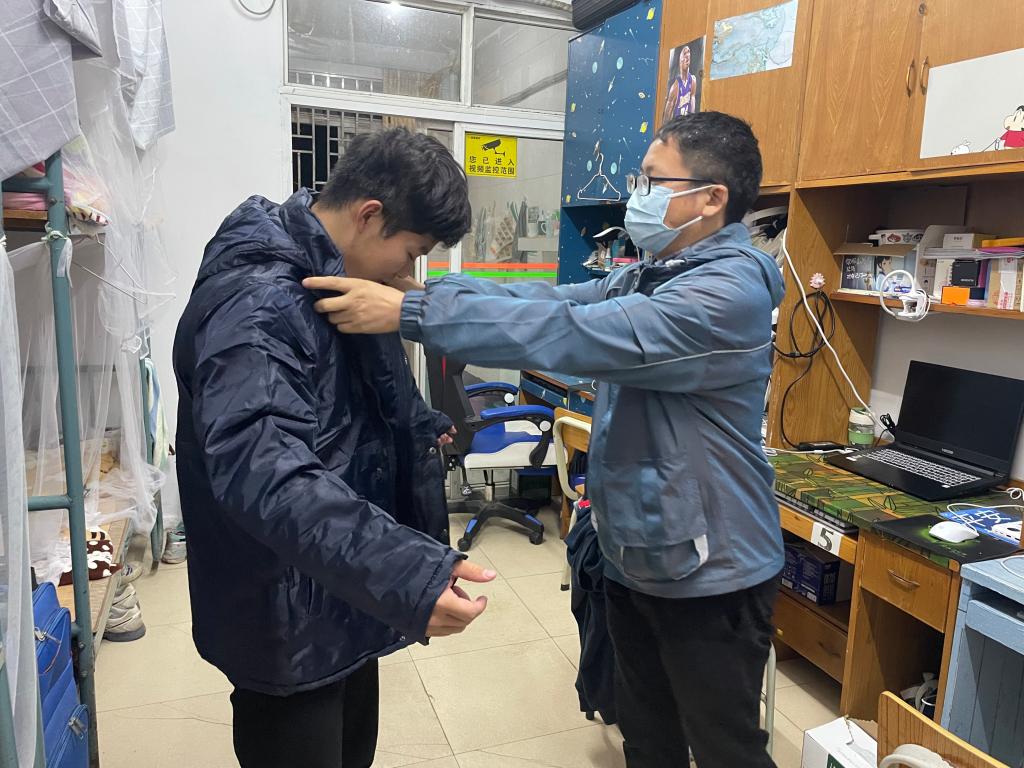 在走访的过程中,陈院长为缺少保暖物资的学生带来了学校发放的棉衣棉被,叮嘱同学们要严格遵守疫情防控管理规定,同时亲切询问同学们的学习、生活情况,传达了学院对每位学生的关心关爱,让学生感受到了家的温暖。