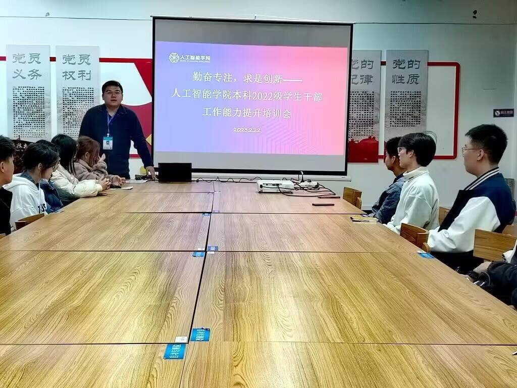 2月22日晚上,人工智能学院在学生社区D区25栋101党团之家召开2022级本科生学生干部工作能力提升培训会。学院2022级本科生辅导员蒋鑫主讲,2022级本科生年级委全体学生干部参加会议。