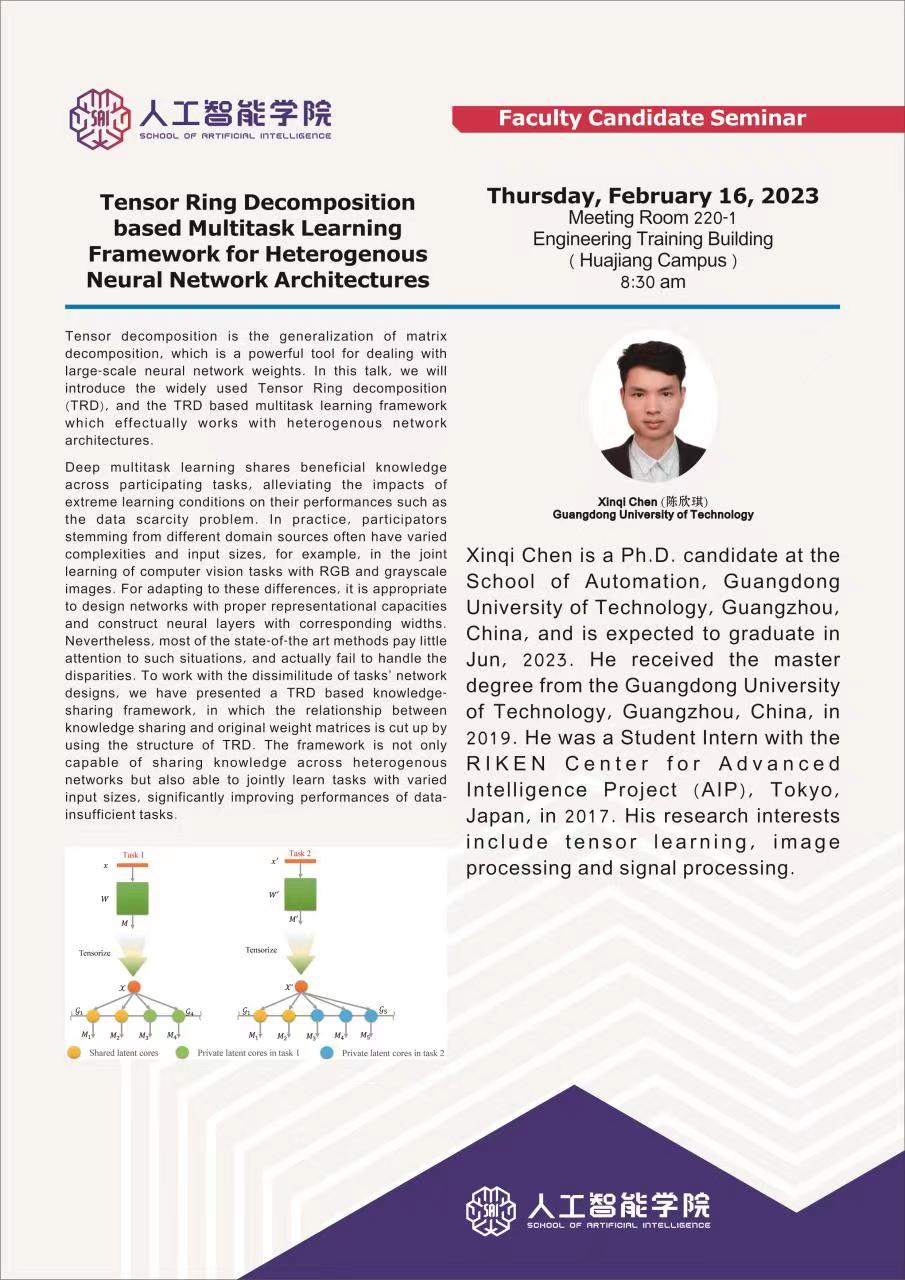 2023年2月16日,陈欣琪博士应三亿官方官网三亿(中国)_三亿(中国)人工智能学院邀请,到实训楼220会议室做题为Tensor Ring Decomposition based Multitask Learning Framework for Heterogenous Neural Network Architectures的学术报告。