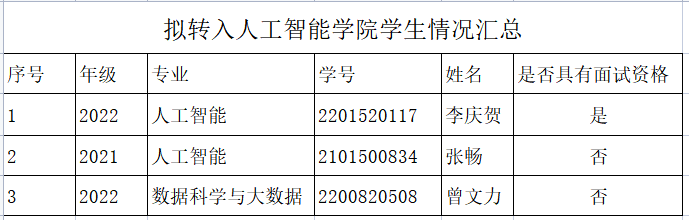 人工智能学院转专业面试时间定于2023年5月12日上午9:00,面试地点:实训楼228会议室、请符合面试资格的同学提前了解面试场地并做好面试准备(成绩单、学分绩我们将从教务系统统一导出,如同学有奖状或证书,请带上奖状或证书的原件及复印件,复印件面试时交予面试老师)。