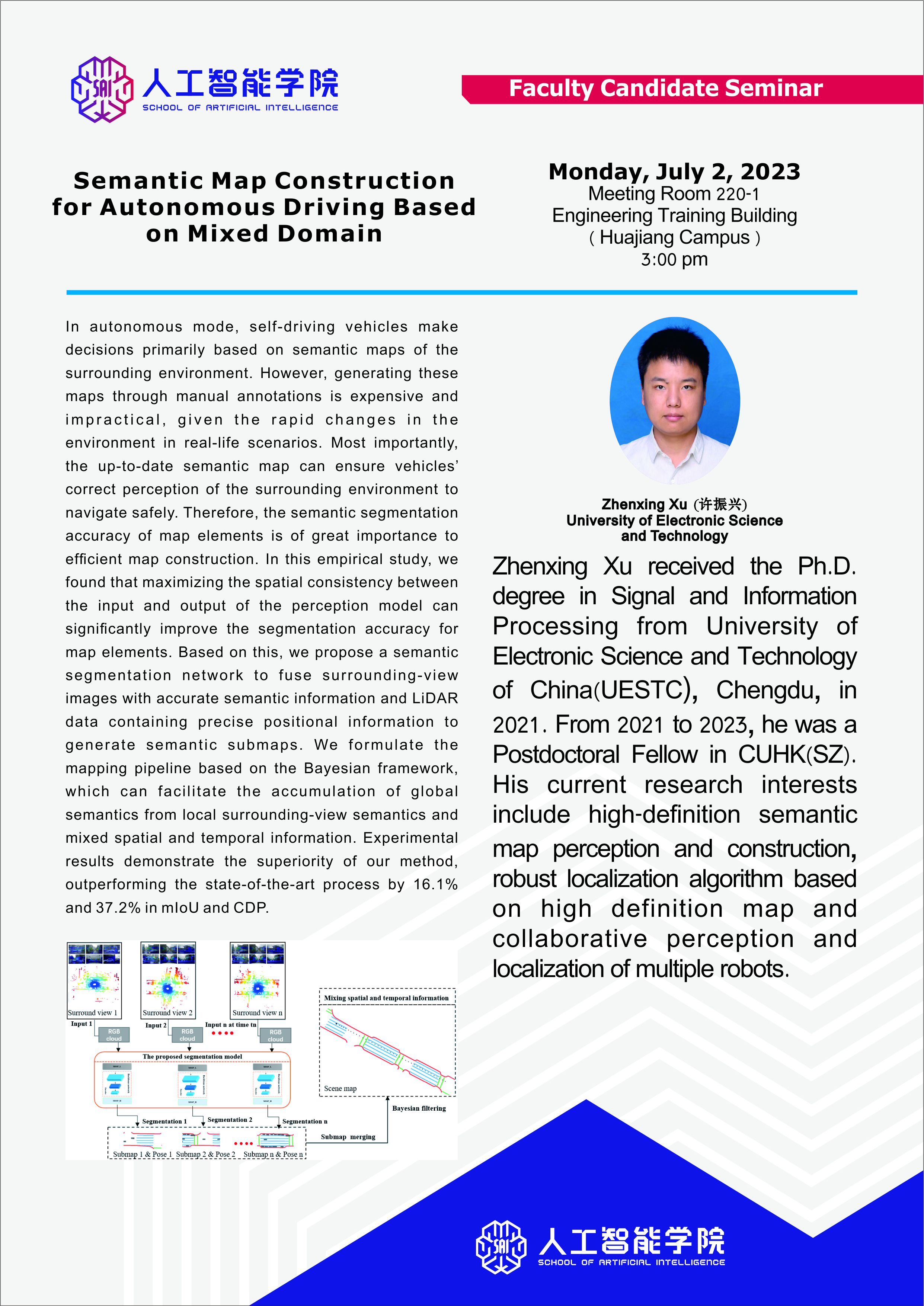 2023年7月7日,许振兴博士应三亿官方官网三亿(中国)_三亿(中国)人工智能学院邀请,到实训楼220会议室做题为Semantic Map Construction for Autonomous Driving Based on Mixed Domain 的学术报告。