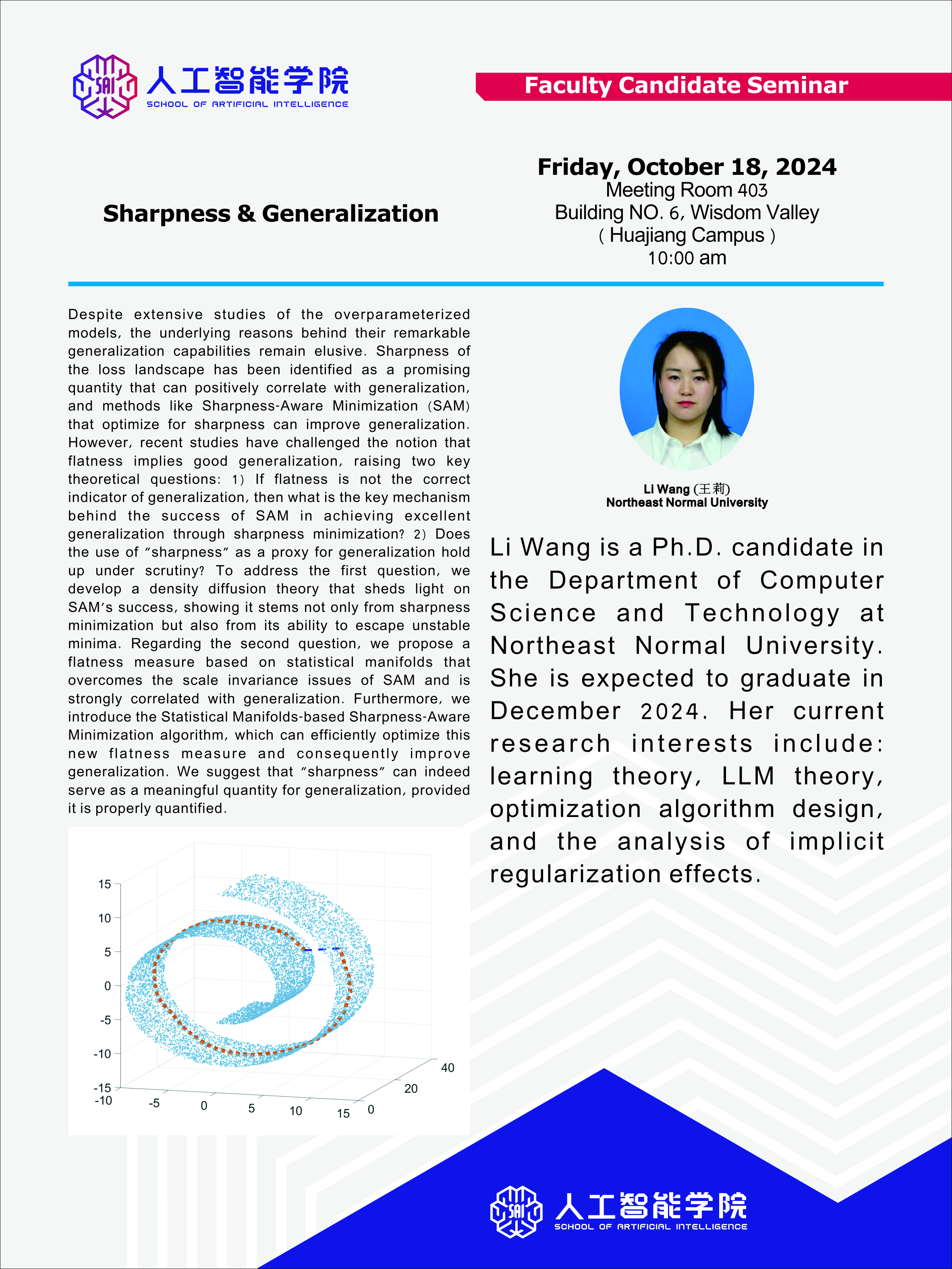2024年10月18日,王莉博士应三亿官方官网三亿(中国)_三亿(中国)人工智能学院邀请,到花江慧谷6号楼403会议室做题为 Sharpness & Generalization的学术报告。