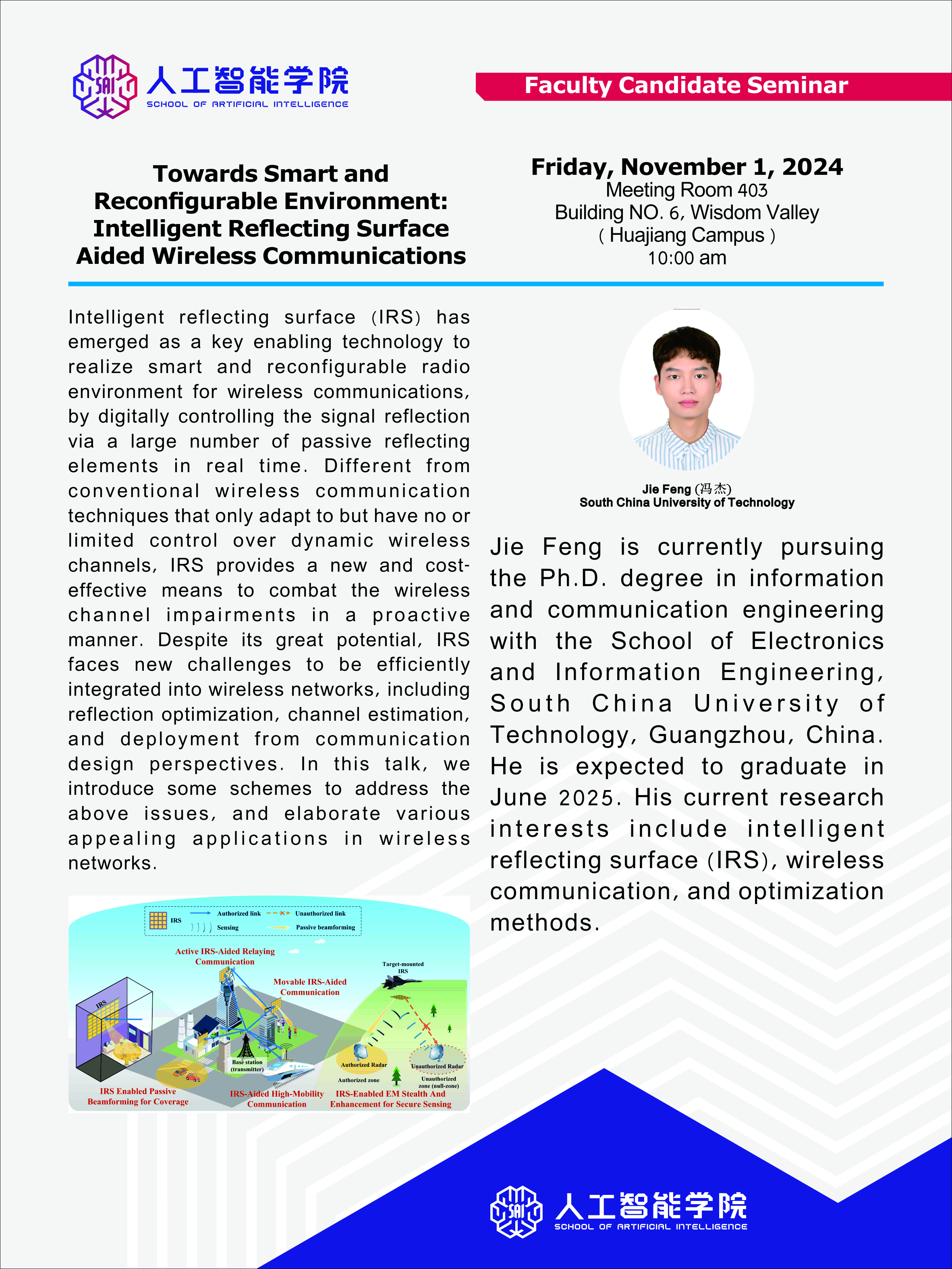 2024年11月01日,冯杰博士应三亿官方官网三亿(中国)_三亿(中国)人工智能学院邀请,到花江慧谷6号楼403会议室做题为Towards Smart and Reconfigurable Environment: Intelligent Reflecting Surface Aided Wireless Communications的学术报告。