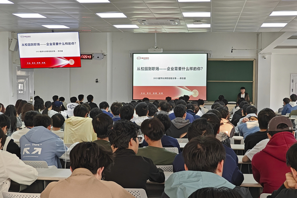 3月23日,人工智能学院举办从校园到职场职业生涯规划分享会,特邀学院2019级毕业生、桂林福达股份有限公司技术骨干郑志盛担任主讲,近200名学生参加。