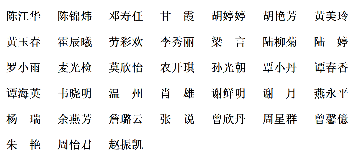 根据《关于认真做好2022-2023年度广西西部计划志愿者招募派遣工作的通知》(大学生志愿服务西部计划广西项目管理办公室发)的要求及笔试工作开展情况,共有56名考生参加笔试,其中线上笔试考生6名,线下考生50名。拟推荐西部计划志愿者19名(不含北海校区),笔试后按1:2比例确定面试人选,由高分到低分确定38人参加面试。现进入面试环节人员共38名,入围面试人员名单如下(名单按姓氏拼音排列)