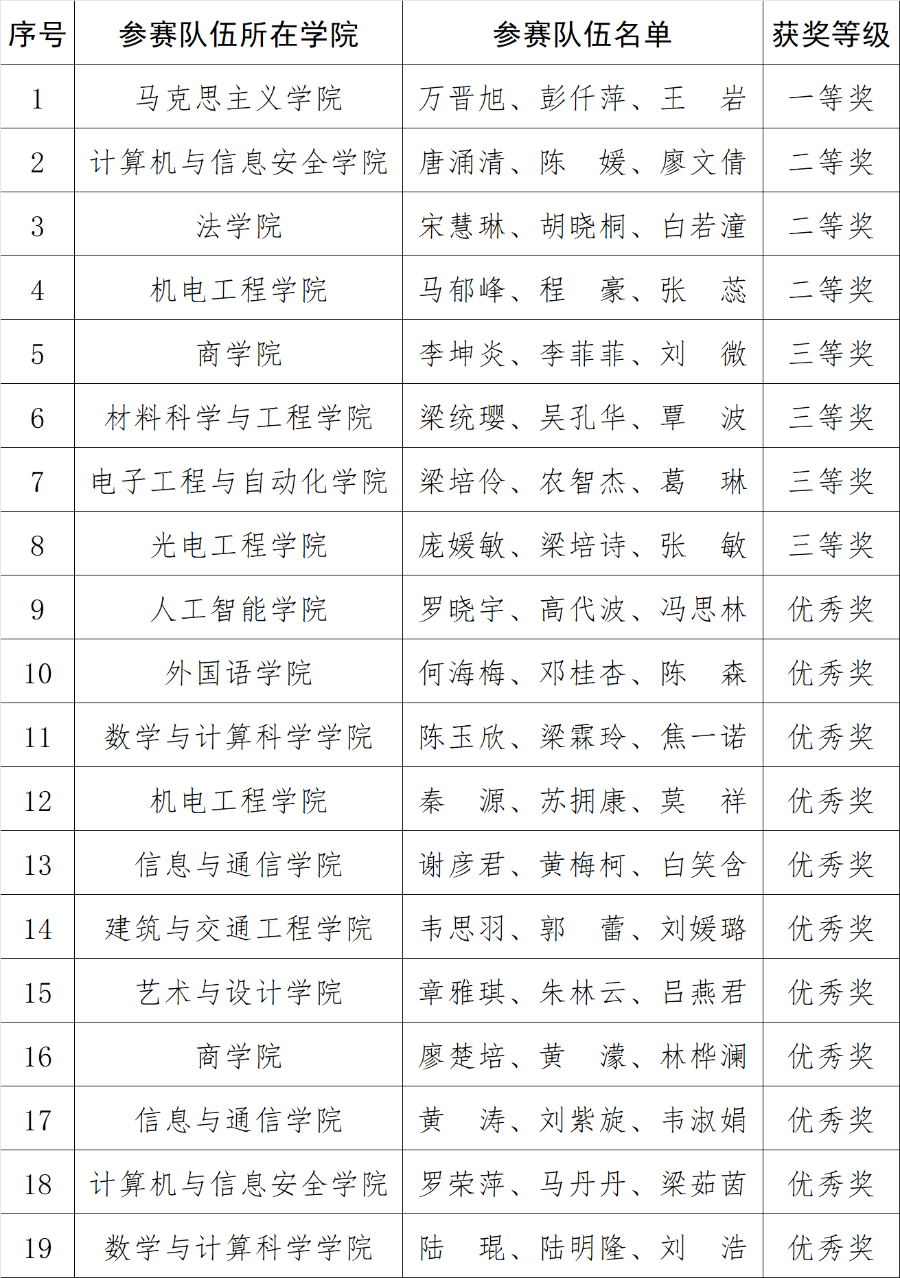由校团委主办,机电工程学院、计算机与信息安全学院承办的“喜迎二十大、永远跟党走、奋进新征程”——2022 年广西“青年大学习”知识挑战赛暨全区青少年铸牢中华民族共同体意识专项赛校内选拔赛经初赛、复赛,现决出一等奖1个,二等奖3个,三等奖4个,优秀奖若干。现将获奖名单公布如下: