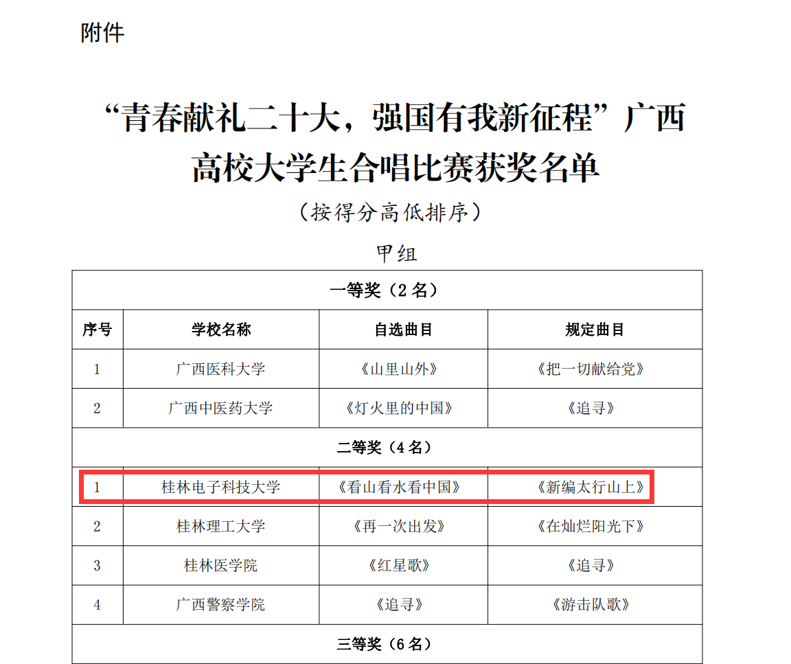 近日,自治区党委教育工委、自治区教育厅《关于公布“青春献礼二十大,强国有我新征程”广西高校大学生合唱比赛结果的通知》发布,三亿官方官网三亿(中国)_三亿(中国)大学生合唱团在全区57支高校队伍中通过激烈角逐脱颖而出,参赛两首作品《看山看水看中国》《新编太行山上》荣获甲组二等奖,并创下总成绩排名第三的历史最好成绩,比赛由王朵朵担任合唱总指挥兼合唱指导教师,赵五一、文如冰担任艺术指导教师。