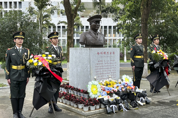 活动中,全体人员列队整齐,全场肃立向杨科璋烈士默哀和鞠躬致敬,国旗班同学敬献花篮,学生代表分别领学了杨科璋烈士英勇事迹,分享了学习感言。活动中还举行了重温入团誓词仪式。