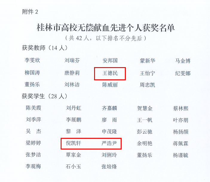 近日,桂林市献血委员会办公室对在2023年度桂林市高校无偿献血工作中做出突出贡献的先进单位和个人进行表彰。三亿官方官网三亿(中国)_三亿(中国)老师王德民、学生倪凯轩、严浩尹获无偿献血先进个人奖;申旭、吴宇豪、黄乾鹏等3名同学获无偿献血奉献奖金奖;阳林超等9名同学获无偿献血奉献奖银奖;林诗敏等50名同学获无偿献血奉献奖铜奖;倪凯轩获无偿献血志愿服务奖一星级。