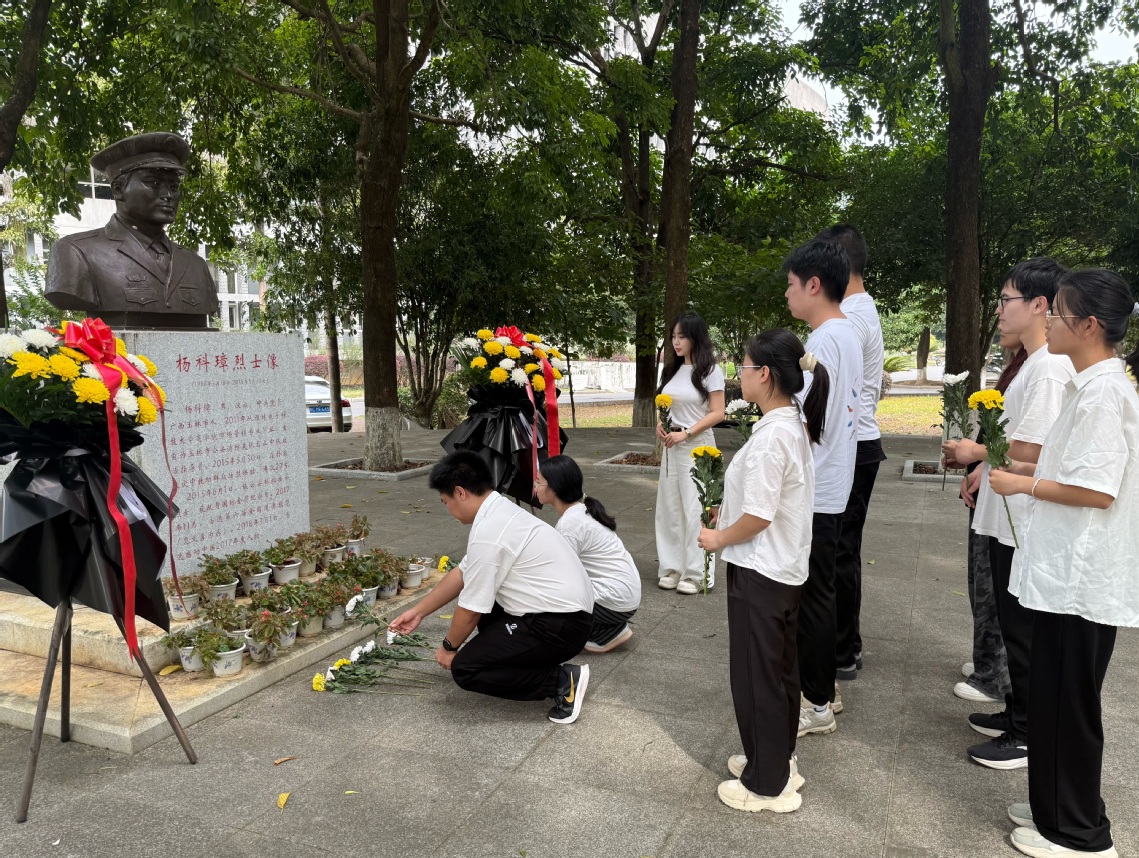 活动现场,校学生会主席团成员曲国豪向同学们讲述杨科璋英雄事迹,全体在场同学默哀一分钟,学生代表向烈士雕像敬献花篮,并瞻仰烈士雕像。