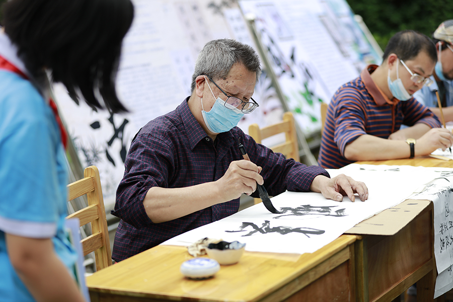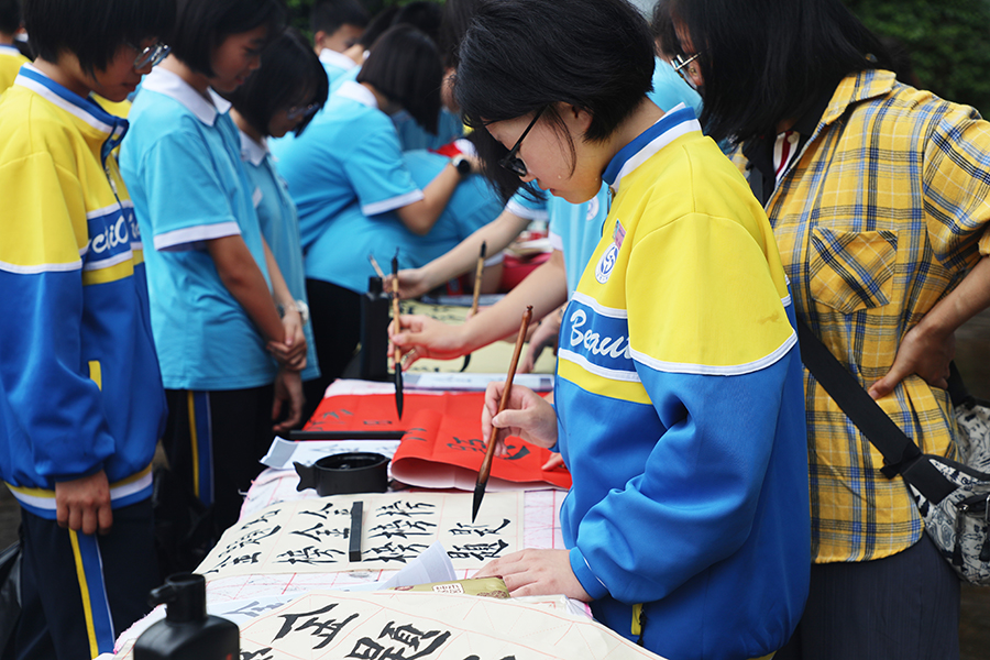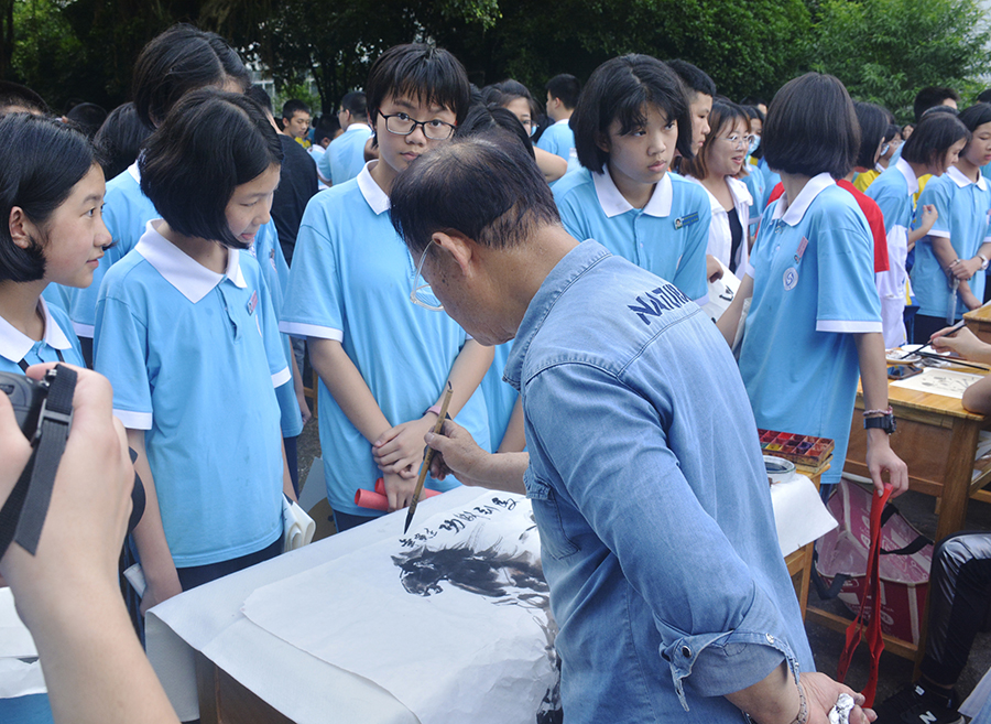传统文化展示区内,有许多家长应邀而来,为同学们带来书法和国画展示,笔法刚劲有力,潇洒飘逸,引得同学们纷纷驻足观赏。