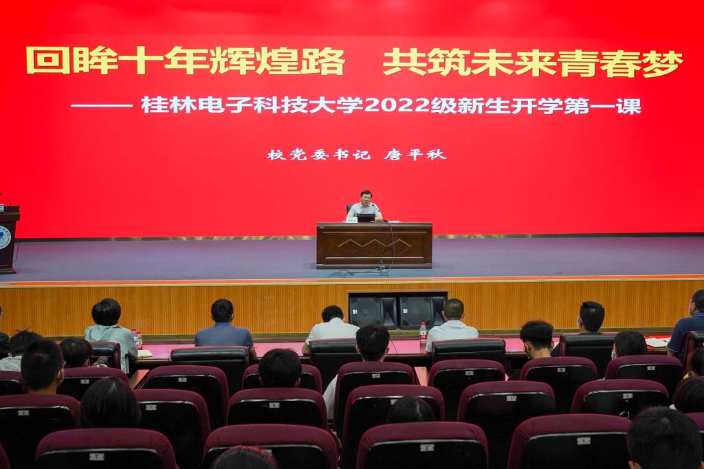 课上,唐平秋向来自全国各地的2022级新生表示热烈欢迎。他从新时代中国发展、中国高等教育发展以及桂电发展三方面回顾了新时代10年辉煌成就。他指出,辉煌10年,中国发展腾飞。中国经济实力跃上新台阶、人民实现全方位生活改善、科技实力显著提升、基础设施建设举世瞩目、改革开放开创新局面。璀璨10年,中国高教巨变。高等教育规模空前扩大、高等教育体系不断完善、高等教育质量不断提高。奋进10年,桂电事业跨越。学校办学综合实力显著增强、核心竞争力全面提升、办学条件明显改善。
