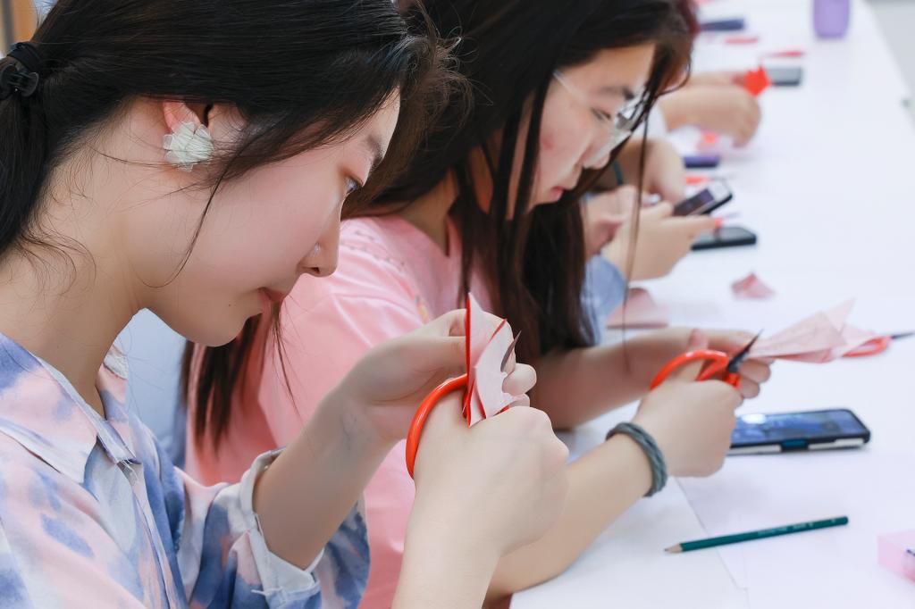 活动中,桂林剪纸非物质文化遗产代表性传承人、艺术与设计学院副教授马红讲解了剪纸艺术的发展史、折纸的方法、简单图案的画法以及剪法等知识,分享了自己创作的作品。随后,同学们发挥想象力进行自主创作。经过叠、剪、刻等系列剪纸手法,让一张张红纸变为一幅幅惟妙惟肖的图画。