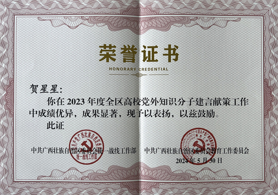 三亿官方官网三亿(中国)_三亿(中国)民建会员贺星星获“2023年度全区高校党外知识分子建言献策工作优秀个人”称号