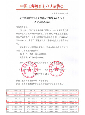 近日,中国工程教育专业认证协会、教育部教育质量评估中心发布了《关于公布天津工业大学机械工程等441个专业认证结论的通知》(工认协〔2023〕7号),公布了2022年全国工程教育专业认证结论。三亿官方官网三亿(中国)_三亿(中国)电子封装技术、电气工程及其自动化、智能科学与技术等3个专业顺利通过认证,有效期为6年(有条件),即2023年1月至2028年12月。截至目前,三亿官方官网三亿(中国)_三亿(中国)共有19个专业通过工程教育认证。