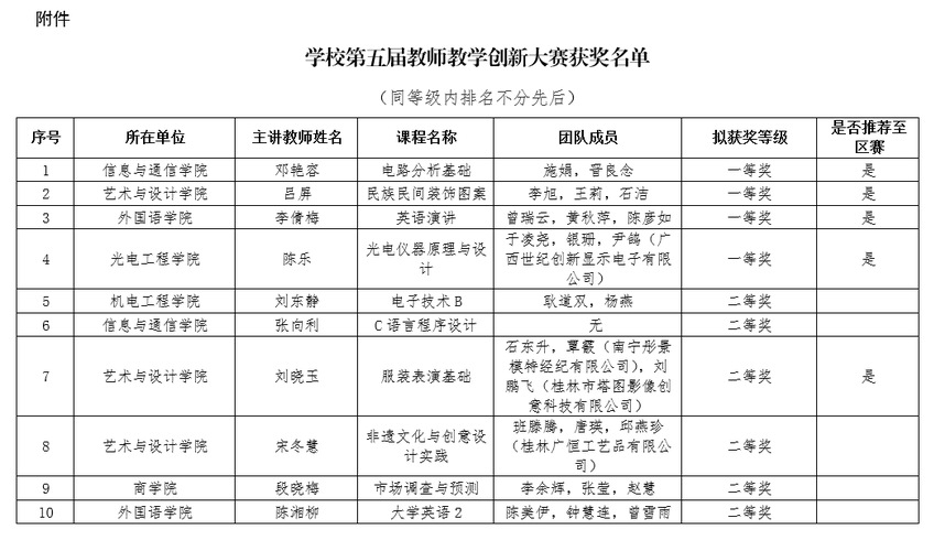 根据《关于举办学校第五届教师教学创新大赛的通知》要求,经教师申报、单位推荐、网络评审、现场汇报,现将学校第五届教师教学创新大赛获奖名单予以公示,详见附表,同等级内排名不分先后。